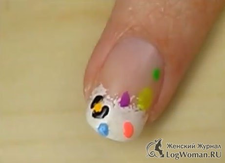 На остальные ногти нанесите с помощью тампона белый лак, закрасив только нижнюю часть.