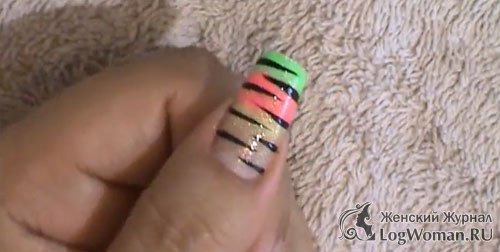 Теперь возьмите черный лак с тоненькой кисточкой и проведите небольшие параллельные линии с отрывом.