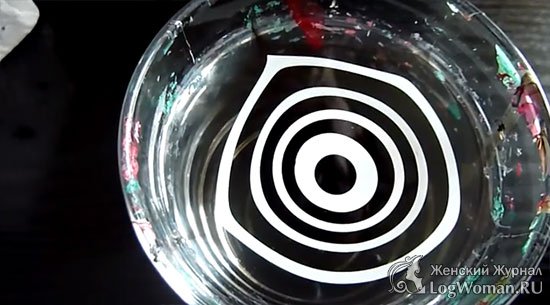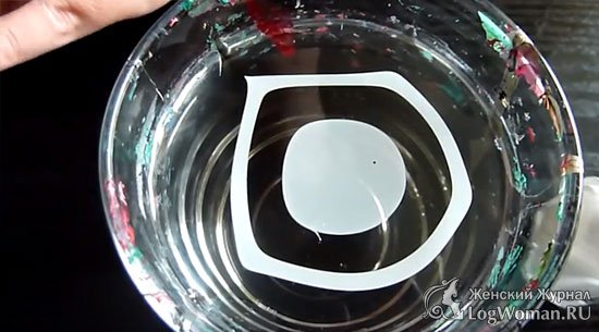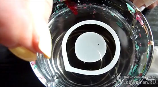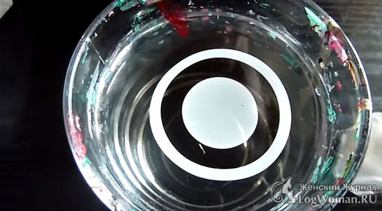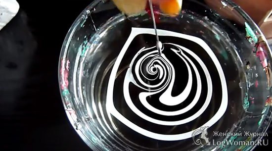 Теперь с помощью иглы растаскиваем окружность в 4 стороны. Обратите внимание сто тащить нужно не за саму окружность из лака, а по воде.