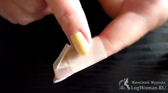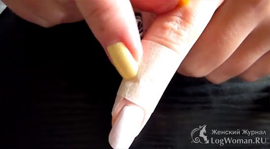 Покрасьте ноготь белым лаком. После обклейте палец тонким лейкопластырем (можно взять лейкопластырь на бумажной основе, так как он легко снимется после).