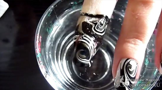 В этом уроке мы рассмотрим как сделать красивые черно-белые разводы на ногтях с помощью воды и черного и белого лака.