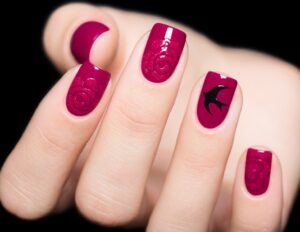 - Стемпинг, когда рисунок с шаблона переносится на ноготь, отлично смотрится на покрытии любого оттенка.