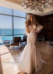При примерке смотрите на длину платья, которая рассчитывается высотой каблуков. Корректировать платье следует только после покупки туфель.