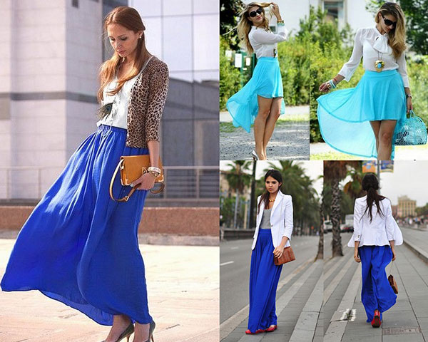 Романтичным особам, несомненно, понравится синяя юбка в пол из легкой материи — см. модный look на фото ниже — с чем сочетается и как можно носить такую длинную юбку.