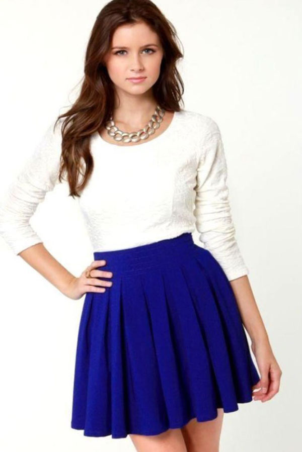 Одна из моделей, прекрасно подходящих для веселого времяпрепровождения — это мини-юбка ярко-синей окраски. На танцполе девушка в юбке цвета электрик будет самой заметной и неотразимой. Главное, не переборщить, дабы не стать посмешищем для окружающих. Показывая обнаженные ноги, верх следует максимально прикрывать.