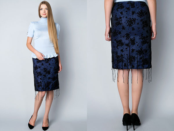 Сотрудница офиса, нарядившаяся в кружевную юбку темно-синего цвета, шелковую блузку лаконичного кроя и туфли на каблуке, непременно привлечет к себе заслуженное внимание сослуживцев.
