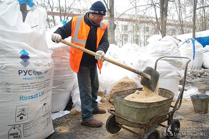 Чаще всего используют пескосоль. Такое сочетание речного песка и технической соли позволяет использовать состав в любых температурных условиях. Он эффективный, доступный, простой в использовании, быстро начинает действовать.