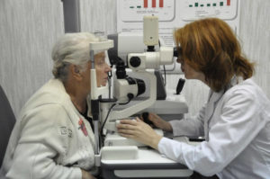· Осмотр глаза пациента врачом с использованием капель атропина для расширения зрачков больного