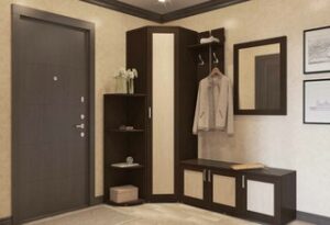 - Угловая. С помощью такой мебели используют по максимуму все имеющееся пространство. Для маленькой прихожей угловая мебель станет превосходным вариантом. Угол не будет пустовать, так как его место займет меблировка. Часто устанавливают угловые шкафы-купе. Они могут быть оснащены открытыми полочками по бокам, тумбами и классическими вешалками. Двери шкафов обычно оснащают зеркалами.