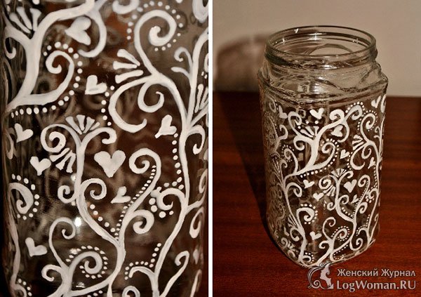 Шаг 2: Возьмите краски по стеклу (их можно найти в любом художественном магазине) и тонкой кистью нарисуйте любой узор на внешней стороне стеклянной банки.