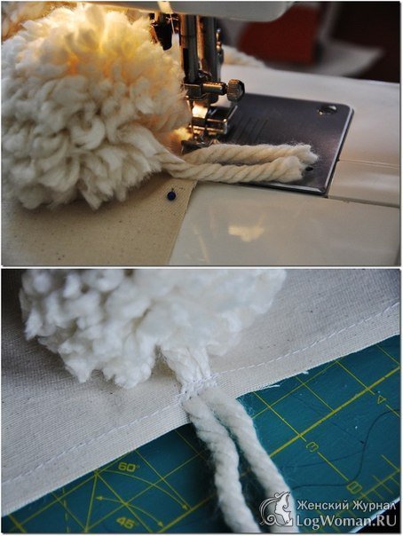 С помощью швейной машинки прострочите все по периметру. Места соединения бубонов и ткани пройдите несколько раз.