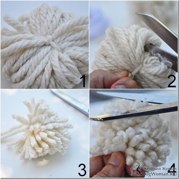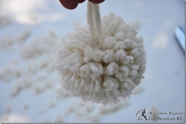 Теперь просунутую нить завяжите на узелок. Ножницами разрежьте кольца бубона. Разровняйте его и если необходимо, то подровняйте обрезав лишние части.