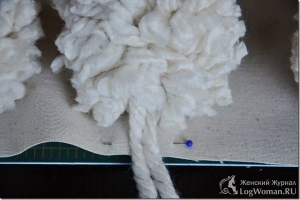 Отрежьте небольшую длину нитки. Она послужит вам соединением бубонов с наволочкой. Обратите внимание что длинна нити будет уменьшена в двое.