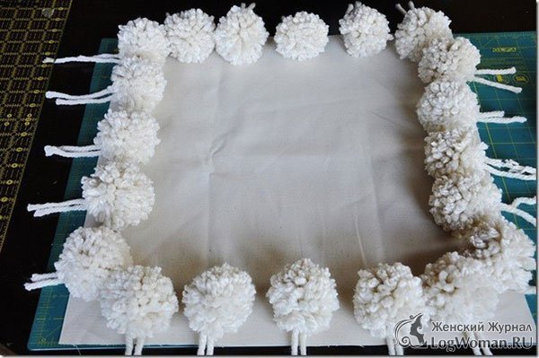 Положите ткань для подушки лицевой частью вверх, а затем разложите на ней бубоны как показано на примере.