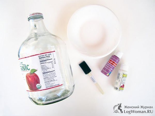 Шаг 1. Вымойте бутылку и снимите все этикетки. Дайте высохнуть Шаг 2. Покрасьте нижнюю часть выбранным цветом. Шаг 3. Теперь оставшийся цвет выдавите в тарелку и добавьте несколько капель белого цвета. Хорошо размешайте Шаг 4. Покрасьте следующую часть приготовленным цветом.