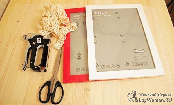 Белая или красная рамка для фотографий, толстая белая лента с вышитым или связанным узором, ножницы и степлер