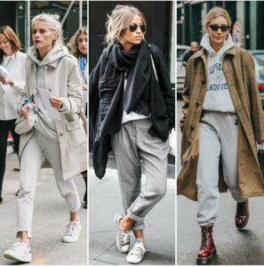 Молодые люди предпочитают стиль, называемый спортивный шик. Он позволяет надевать спортивные брюки сверху элегантное пальто. На ноги, как правило, надеваются кроссовки. Таким образом одеваются не только девушки но и парни. Вместо пальто можно использовать свободную куртку.