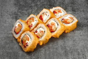 Сваренный и охлажденный рис заправляют уксусом, солью и сахаром по вкусу. Готовят начинку – сыр, рыбу и огурец, нарезают брусочками, также можете использовать креветки или икру. Затем на циновку, застеленную пленкой, расстилают лист нори, распределяют ровным слоем рис и выкладывают начинку. После приступают к формованию ролла, плотно скручивая его с помощью коврика, также нередко делают обратные роллы, когда рисом обволакивают нори. Готовый рулет аккуратно погружают в заранее приготовленный кляр Темпура, после обваливают в сухарях. Обжаривают в горячем масле, как только появилась румяная корочка, рулет вынимают и выкладывают на салфетку, после нарезают на одинаковые кусочки и посыпают кунжутом.