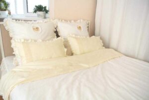 - Шитье. Начните с пошива наволочек, затем переходите к простыням и покрывалам. Не забудьте оставить отверстия для молний или пуговиц, если планируете их использовать.