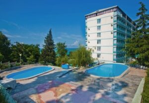 2. Азимут Отель Прометей – удобное месторасположение сделало данный санаторий одним из самых популярных. На его территории имеется комфортабельная детская площадка, на которой дети с удовольствием будут развлекаться. Также Азимут Отель расположен в 250 метрах от моря. Тип питания детский стол. Пребывание детей с рождения до 4 лет без лечения, а с 4 лет с нужным лечением под наблюдением опытного педиатра. В стоимость отелем входят услуги бассейна, детскими игровыми комнатами, небольшой аква-зоной. Принято считать данный пансионат семейным, на который съезжаются все члены семьи для полноценного варианта отдыха.